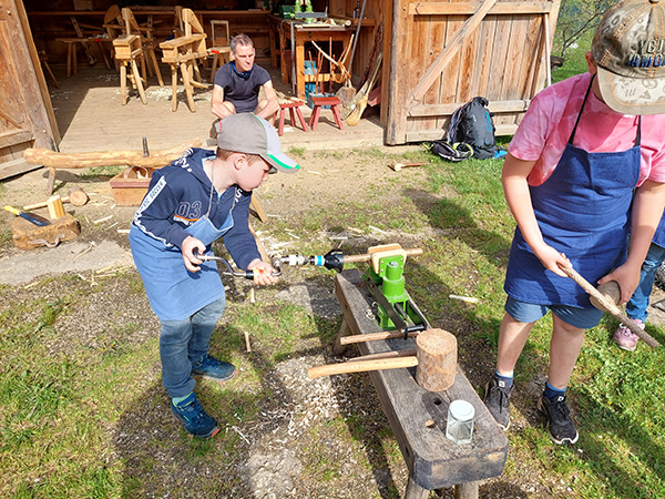 Am Anfang steht eine spannende Wanderung durch unser Schutzgebiet. Am Großdöllnerhof könnt ihr traditionelle Arbeitsweisen aus Ur-Großmutters Zeiten ausprobieren.